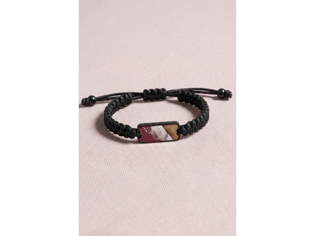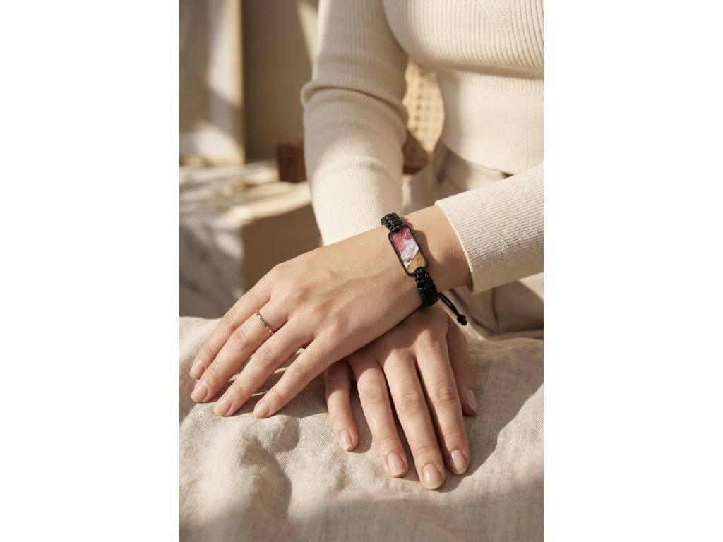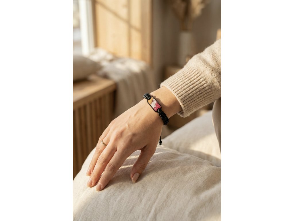 Dieses Baumwollarmband fertigen wir für alle Verliebten aus unserer limitierten Edition der rosafarbenen Harzserie Rose Dream.