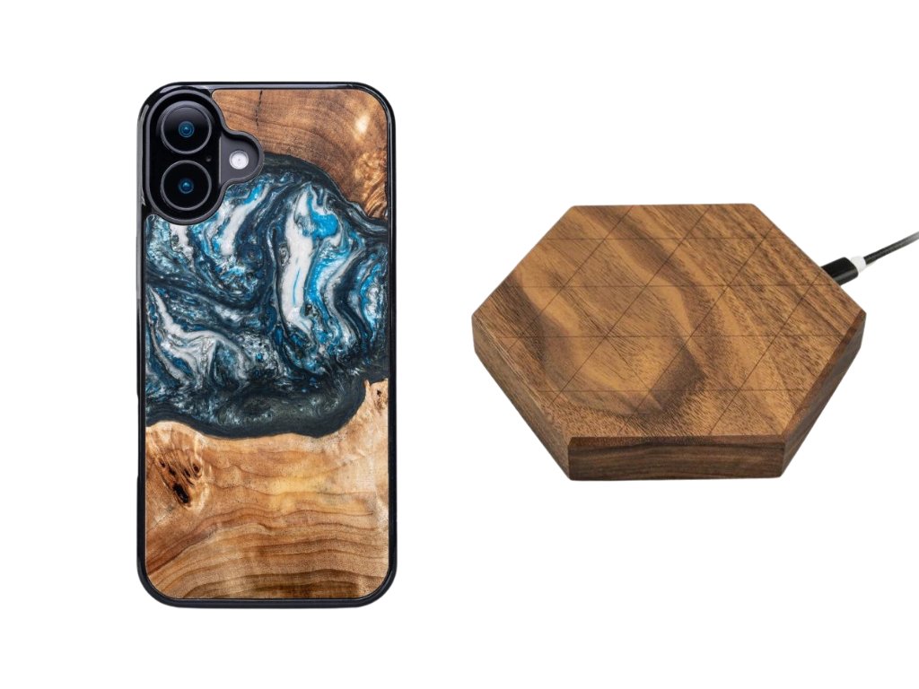 Enthält eine Handyhülle mit Harz nach Ihrer Wahl sowie das kabellose Ladegerät Slim Hexagon QI 15W nuss.