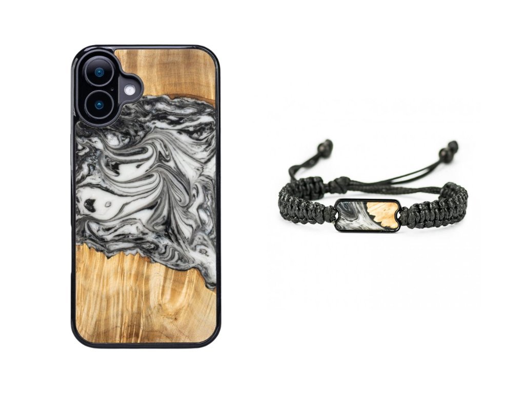 Das Set Mond enthält eine Handyhülle mit Epoxidharz sowie ein Kordelarmband mit Epoxidharz – beide im Design Mond.