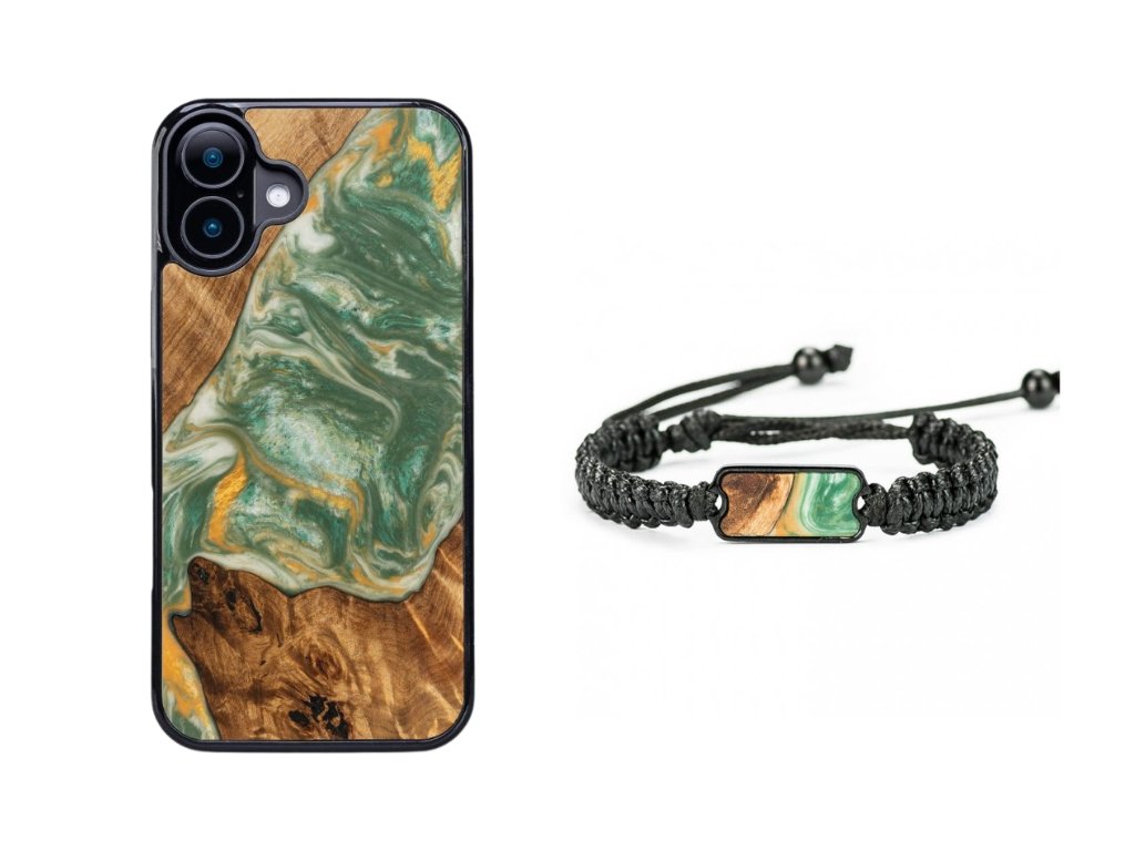 Das Set Wasser enthält eine Handyhülle mit Epoxidharz sowie ein armband kordel mit Epoxidharz – beide im Design Wasser.